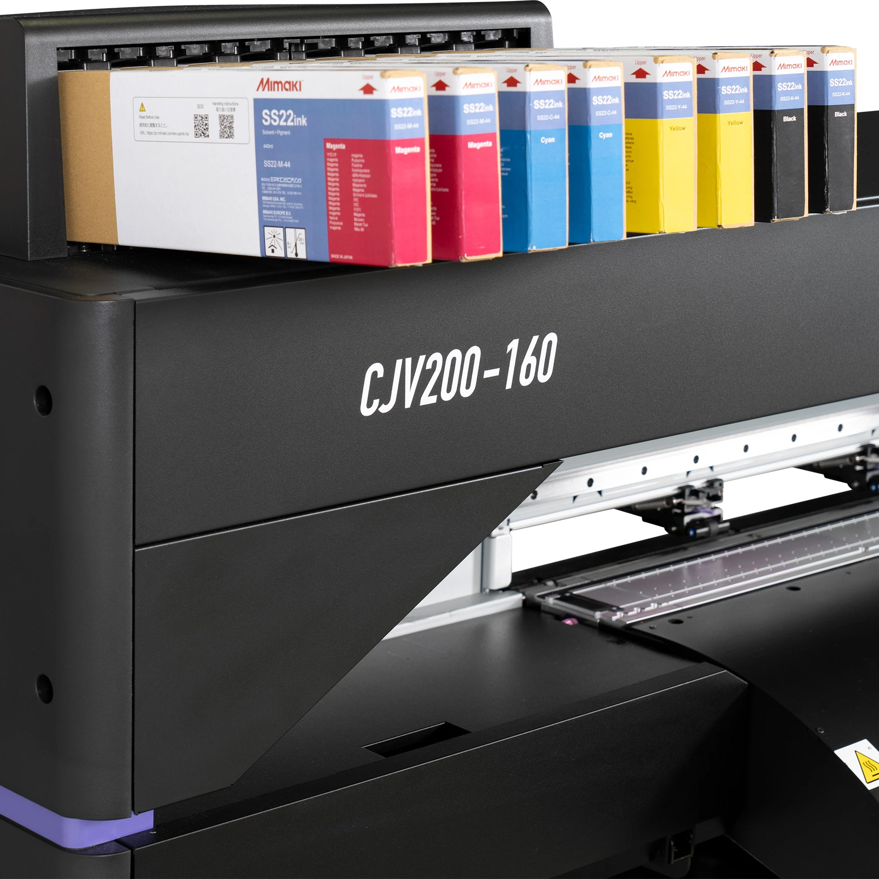Imprimante Mimaki CJV200-160 éco-solvant 2-en-1 Print & Cut. Qualité pro, encres SS22 sans GBL. Idéale pour signalétique POS, PLV, enseignes et marquage véhicule.